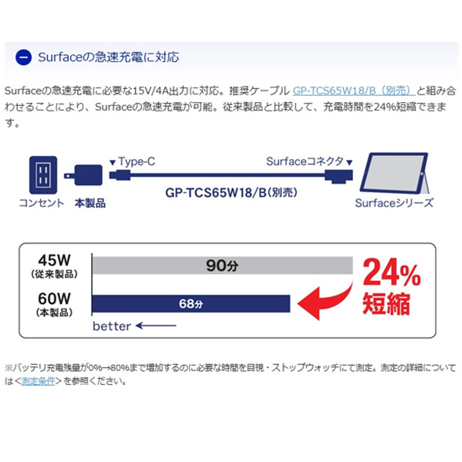 推奨ケーブル GP-TCS65W18/B(別売)と組み合わせることにより、Surfaceの急速充電が可能。