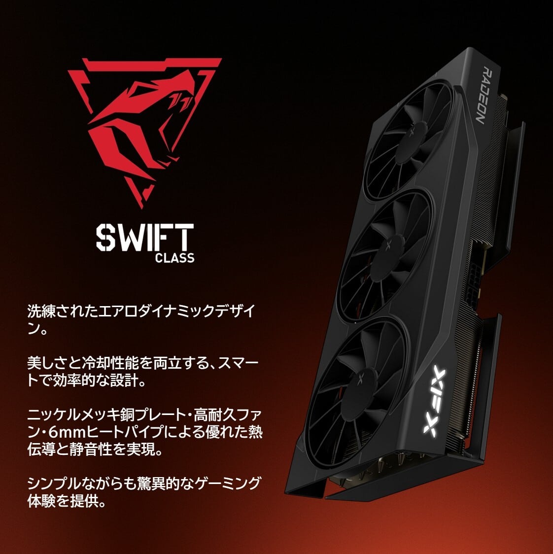 Swiftクラスは、クリーンでエレガントなデザインを通して、現代的なエアロダイナミックスタイルを体現しています。エアフローを最大化し、冷却性能とパフォーマンスを向上させることを唯一の目的とした、考え抜かれた設計です。Swiftシリーズのグラフィックカードは、XFXのエントリーレベルのグラフィックカードです。Swiftモデルのグラフィックカードは優れた冷却性能を備え、無駄を省いた驚異的なゲーミングパフォーマンスを提供します。