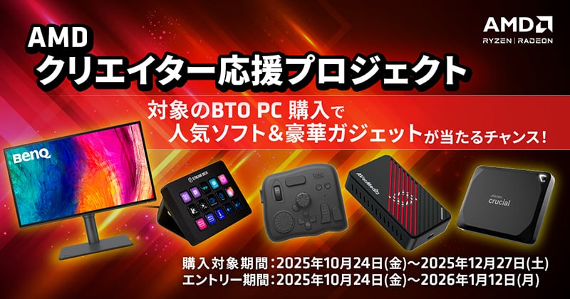 期間中に対象CPUまたはGPU搭載のBTO PCを購入したユーザーに、豪華賞品を抽選でプレゼントします。